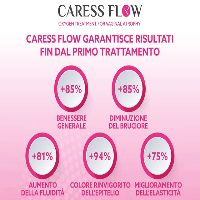 CARESS FLOW è un protocollo di stimolazione della mucosa vaginale basato sull’utilizzo combinato di ossigeno ad alta concentrazione ed una soluzione di acido ialuronico a basso peso molecolare, con lo scopo di trattare l’Atrofia Vulvo vaginale e la Secchezza vaginale.